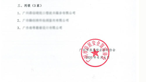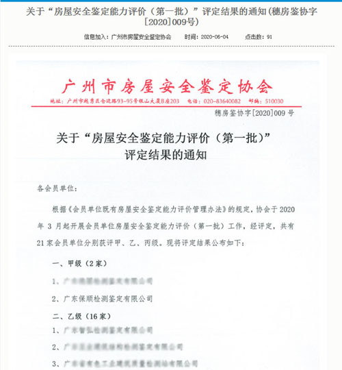2020年6月4日,广州市房屋安全鉴定协会在官方网站上发布了《关于“房屋安全鉴定能力评价(第一批)”评定结果的通知(穗房鉴协字[2020]009号)》,公布了本次分别获评甲、乙、丙级的单位,共有21家获评,其中获评甲级的仅有两家,保顺为其中一家。