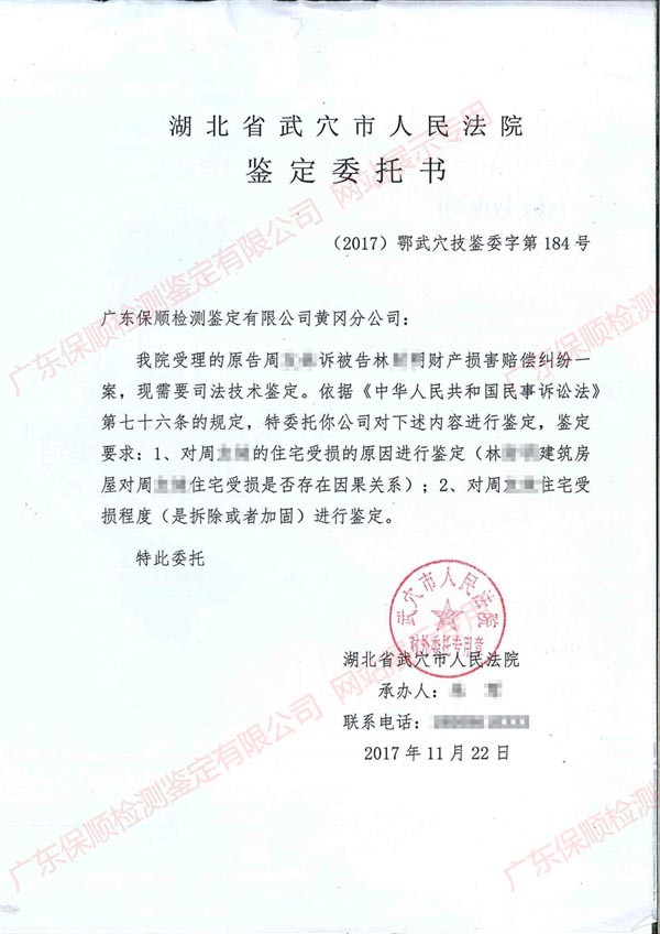 由湖北省武穴市人民法院审理的原告周**诉被告林**财产损害赔偿纠纷一案,因案情需要,我司对林**建筑房屋与周**房屋受损是否存在因果关系和周**房屋受损程度(拆除或者加固)进行相关房屋检测鉴定。