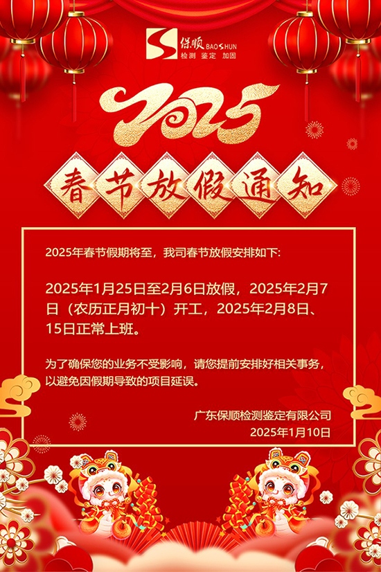 2025年春节假期将至,广东保顺检测鉴定有限公司2025年春节放假安排如下: