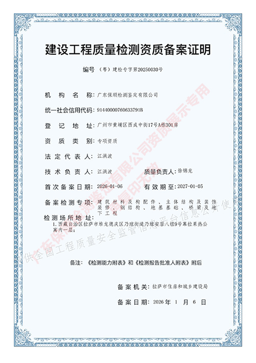 2026年1月6日,广东保顺检测鉴定有限公司通过西藏自治区拉萨市住房和城乡建设局的审核,获得(西藏)建设工程质量检测资质备案证明,证书编号:(粤)建检专字第20250030号,检测专项包括:地基基础专项检测、主体结构及装饰装修专项检测、钢结构专项检测、建筑材料及构配件专项检测、桥梁及地下工程专项检测。